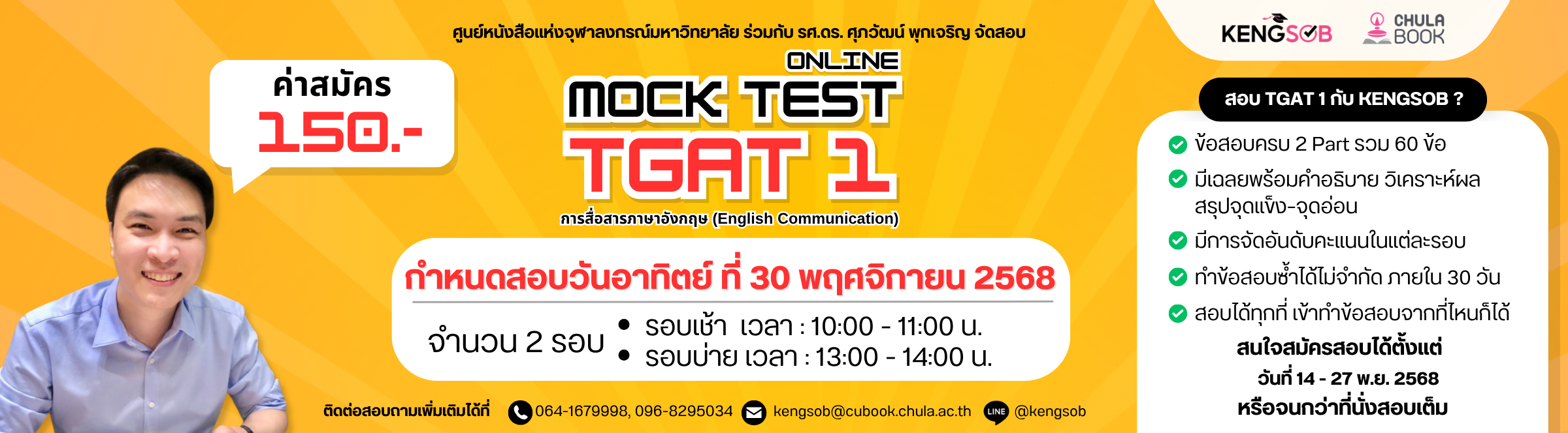 ระบบจำลองการสอบวัดทักษะการสื่อสารภาษาอังกฤษออนไลน์เสมือนจริง บนแพลตฟอร์ม "เก่งสอบ(Kengsob)" ทั้งรูปแบบข้อสอบ ระบบจับเวลา มีการจัดอันดับคะแนนในแต่ละรอบ การวิเคราะห์ผล สรุปจุดแข็ง จุดอ่อน และเฉลยอธิบายละเอียด สามารถทำข้อสอบซ้ำได้ไม่จำกัด ภายใน 30 วัน สอบได้ทุกที่ เข้าทำข้อสอบออนไลน์จากที่ไหนก็ได้ ข้อสอบจัดทำโดย "ศูนย์หนังสือแห่งจุฬาฯ ร่วมกับ รศ.ดร. ศุภวัฒน์ พุกเจริญ" โดยจัดทำขึ้นใหม่ทั้งหมด อิงรูปแบบ โครงสร้าง และระดับความยากตามแนวข้อสอบจริงปีล่าสุด เพื่อให้ผู้เข้าสอบได้สัมผัสประสบการณ์ที่ใกล้เคียงการสอบจริง