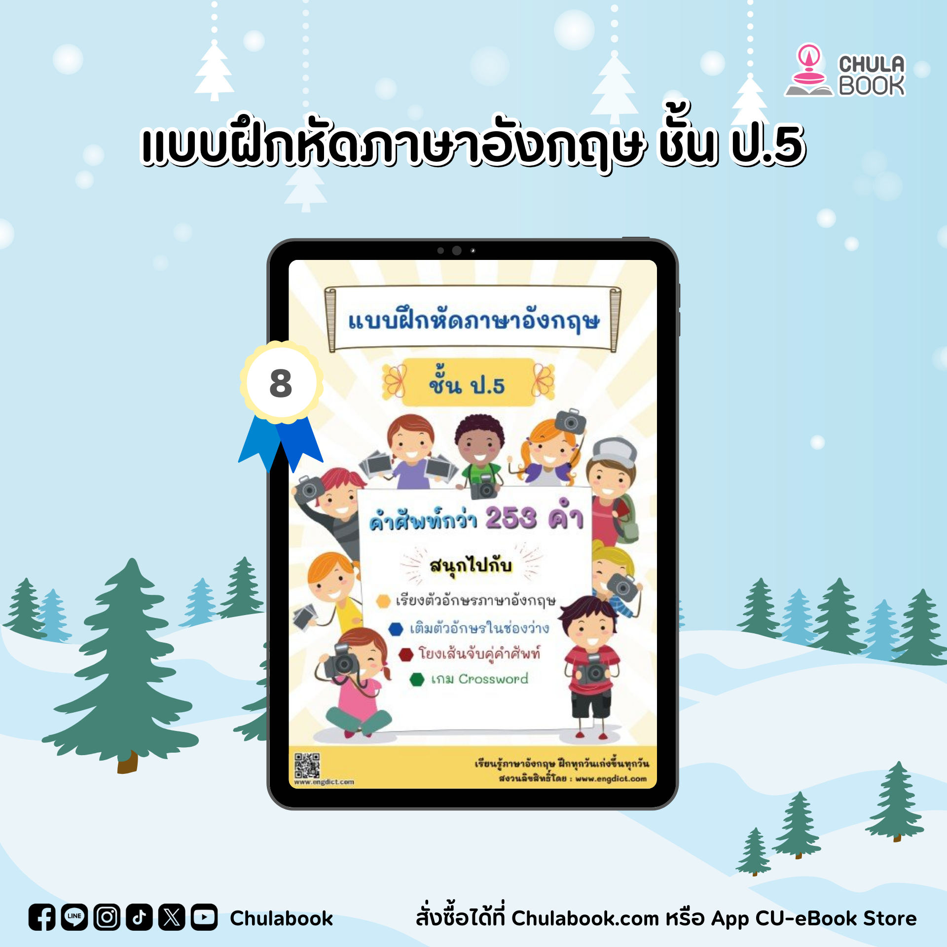 เพลิดเพลินกับการฝึกคำศัพท์ ในรูปแบบของแบบฝึกหัดภาษาอังกฤษ ชั้น ป.5 กว่า 254 คำ เต็มอิ่มไปกับแบบฝึกสนุกๆกว่า 23 ชุด ตัวอย่างเช่น เกมปริศนา crossword การโยงเส้นจับคู่รูปภาพ เติมตัวอักษรในช่องว่าง การเรียงตัวอักษร รูปภาพประกอบคำศัพท์สวยๆช่วยในการค้นหาและจดจำ ไฮไลท์สีคำศัพท์เพิ่มทักษะการอ่านสะกดคำ