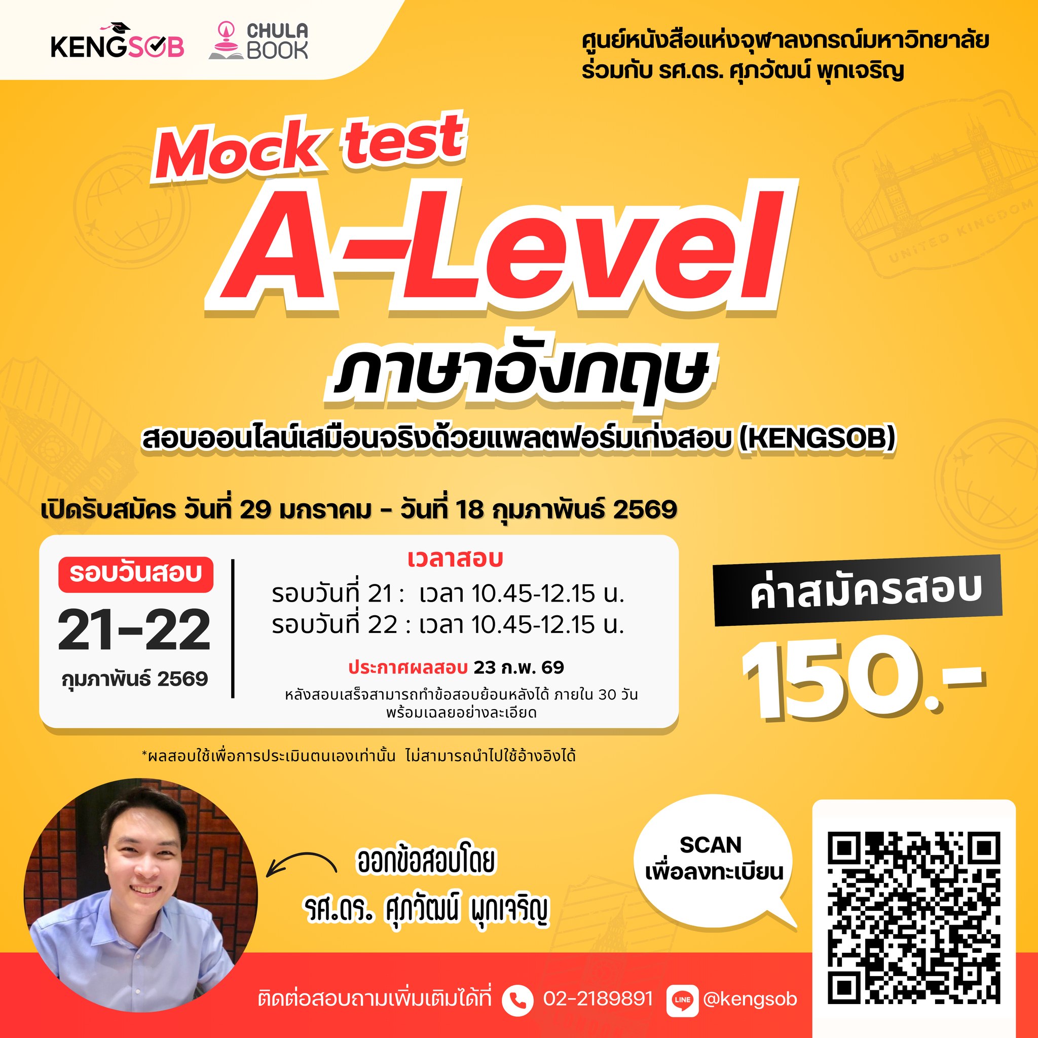 แพลตฟอร์ม KENGSOB เปิดสอบ Mock Test A-Level รอบเดือนกุมภาพันธ์ 2569 ในรูปแบบ สอบออนไลน์เสมือนจริง เพื่อช่วยให้นักเรียนใช้ประเมินความพร้อมก่อนเข้าสู่การสอบจริง ผู้เข้าสอบจะได้รับผลสอบพร้อมเฉลยละเอียด ครอบคลุมแนวข้อสอบตามรูปแบบ A-Level ล่าสุด